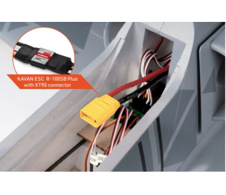 Der sorgfältig mit Karbon verstärkte Rumpf aus EPO-Schaumstoff ist mit dem 80-mm-EDF-Lüfter mit Brushless-Motor C3552-2000 sowie dem Geschwindigkeitsregler KAVAN R-100SB Plus ausgestattet, der über einen leistungsstarken SBEC-Stabilisator verfügt, der zur Versorgung der 8 Servos an Bord benötigt wird. Der abnehmbare obere Teil des Rumpfschwanzes, der mit Schrauben befestigt ist, bietet einen einfachen Zugang zum Lüfter und zum Motor. Das abnehmbare Verdeck wird durch einen Haken an der Vorderseite und einen Riegel an der Rückseite gesichert. Das Kabinenfach bietet viel Platz für Ihren Empfänger und Ihr Flugpaket.