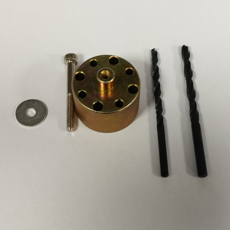 Drill guide for GP38, GP61, GP76 engines - Great Power Engines. High quality (steel) supplied with screw, washer and two drill bits.