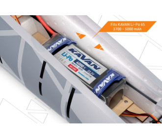 The carefully carbon-reinforced EPO foam fuselage is fitted with the 80 mm EDF fan with C3552-2000 brushless motor, as well as the KAVAN R-100SB Plus speed controller, featuring a powerful SBEC stabilizer needed to power the 8 servos on board. The removable upper fuselage tail section, secured by screws, provides easy access to the fan and motor. The removable canopy is secured by a hook at the front and a latch at the rear. The cabin compartment offers ample space for your receiver and flight pack.