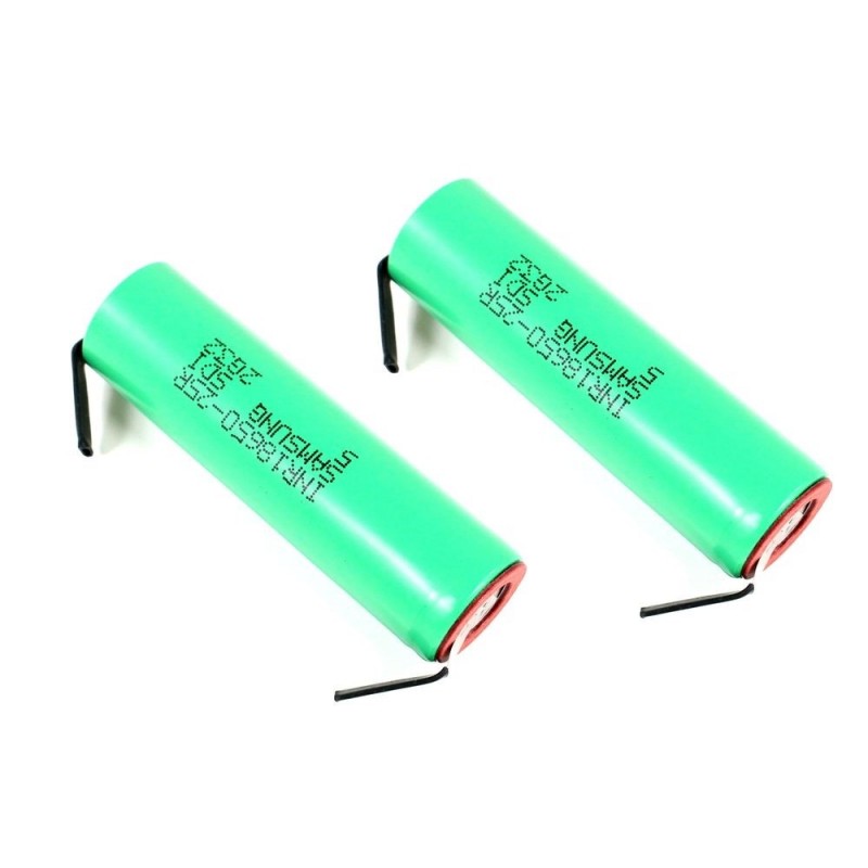 Juego de 2 pilas SAMSUNG LiIon 2500mAh 3,6V nominal, formato 18650.Corriente de descarga: hasta 20A.Especificaciones:Peso: 45 gr.Diámetro: 18mmLongitud: 65mmCapacidad nominal: 2500mAhGama de capacidad: 2350 a 2500mAhTensión máxima de recarga: 4,2V +/- 0,03VVersión con lengüetas de soldadura