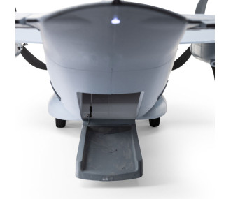 Hay ocho servos instalados de fábrica, los servos de control de superficie son todos de engranajes metálicos, al igual que el servo de la puerta de carga funcional, por lo que puede transportar y arrojar su carga desde la gran bodega. Las luces LED reales de aterrizaje, navegación y estroboscópicas simuladas se alimentan de la batería de vuelo para que pueda volar desde el amanecer hasta el anochecer, desde superficies pavimentadas, hierba, tierra, nieve con los esquís incluidos o grandes estanques y lagos con los flotadores opcionales (se venden por separado). Retire el cono del morro fijado magnéticamente para instalar una GoPro® o una cámara similar y grabar imágenes aéreas en HD o monte una cámara FPV independiente en la gran escotilla superior (las cámaras/equipos se venden por separado). Además, puede utilizar las calcomanías incluidas para decorar el acabado gris, ahora totalmente pintado, con marcas de: la Guardia Nacional Aérea de Ohio, la Fuerza Aérea, el Ejército, la Guardia Costera, la Infantería de Marina, la Armada y otros, ¡para personalizar su modelo! Y el resultado es el avión bimotor más capaz, versátil y divertido de volar para una amplia gama de pilotos. Desde pilotos intermedios hasta experimentados interesados en la escala, el deporte y las acrobacias agresivas en 3D.