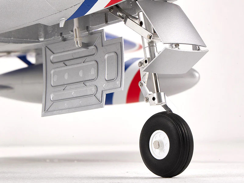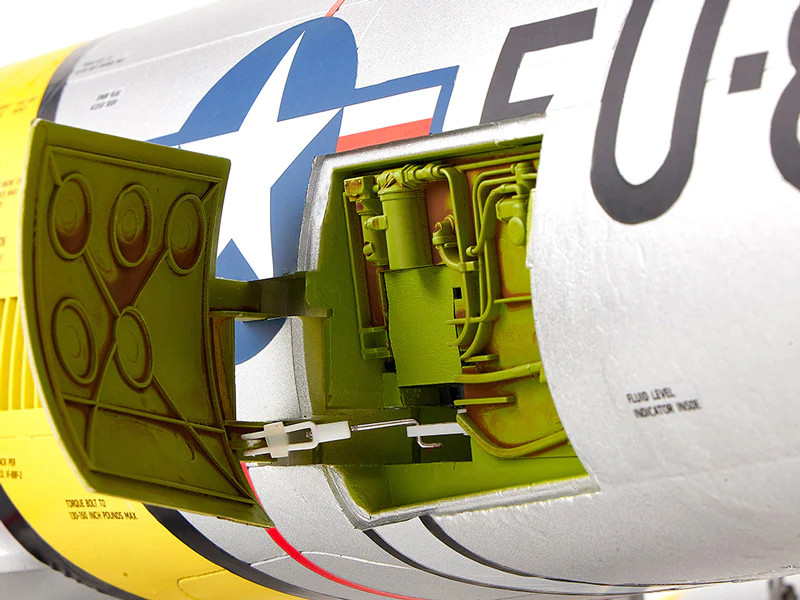 S'appuyant sur sa vaste expérience dans le développement de modèles réduits d'avions de combat télécommandés, FMS a déployé des efforts considérables pour reproduire fidèlement le légendaire et classique F-86 "Sabre" avec le standard de produit "apparence parfaite, performances excellentes". Le modèle comporte de nombreux détails réalistes, tels que les portes du train d'atterrissage, le train d'atterrissage rétractable usiné CNC, les aérofreins mobiles, les feux de navigation des ailes (rouge à gauche, vert à droite), les feux de navigation des tuyères (un rouge, un blanc) et les feux d'atterrissage (blancs). Les détails statiques de l'extérieur de la maquette ont également été traités avec soin, notamment les réservoirs de carburant, l'intérieur du cockpit (pièces en plastique moulé) et les antennes. Il convient de mentionner que les pièces plastiques intérieures du cockpit et les aérofreins ont tous deux subi un processus d'antiquisation, créant un pont vers le passé.