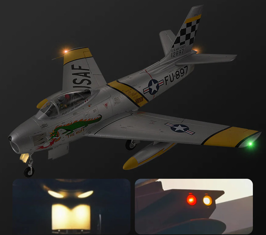 Le F-86 est équipé d'un large éventail d'effets lumineux, notamment les feux de navigation (rouge à gauche, vert à droite), les feux de navigation des tuyères (un rouge, un blanc) et les feux d'atterrissage (blancs), ce qui renforce l'aspect authentique de l'avion.