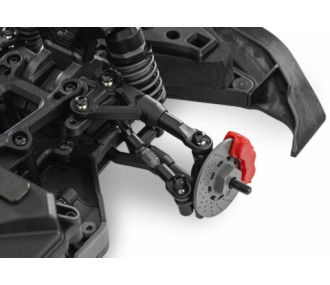 Il supporto della batteria a sgancio rapido consente di utilizzare diverse batterie. Le sospensioni completamente regolabili consentono di adattare il veicolo a tutti gli stili di guida e alle superfici della pista, con impostazioni per campanatura, centro di rollio, ackerman, escursione, convergenza e bump steer.