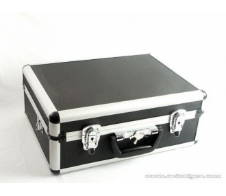 Custodia in alluminio per due trasmettitori con schiuma pretagliata, che consente di tagliare la schiuma in base alla forma dei trasmettitori.