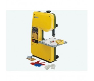 230 V. Velocità di taglio regolabile da 180 a 330 giri/min (effetto feedback). Distanza tra lama e alloggiamento: 150 mm. Altezza massima di taglio 80 mm. Tavolo da lavoro 200 x 200 mm (inclinabile da 0 a 45°). La macchina viene fornita con un nastro da 1.065 x 5 x 0,4 mm (14 denti).