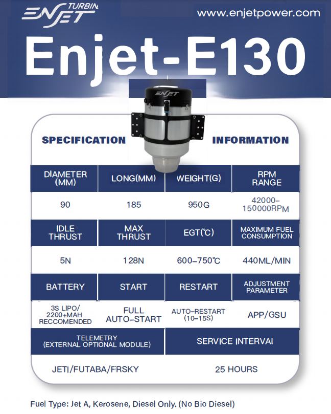 La turbina Enjet E130 si impone come riferimento per motorizzare modelli da 10 a 14 kg. Che tu piloti un jet sportivo per acrobazie sfrenate o una riproduzione dettagliata che richiede una spinta decisa al decollo, la E130 risponde sempre con la regolarità di un metronomo.